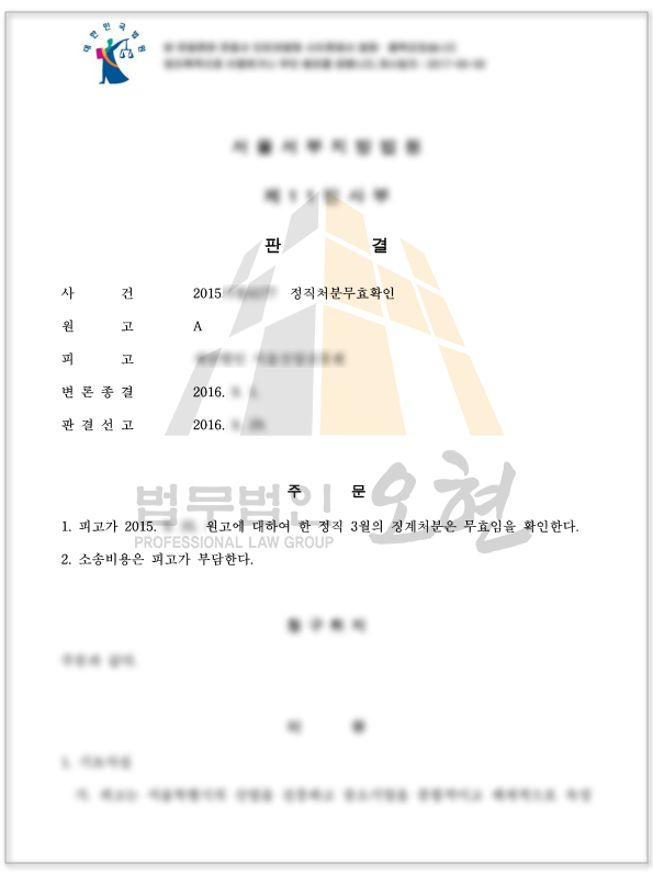 민사│전부승소│정직처분무효소송│징계절차 위반으로 무효 확정 받은 사건