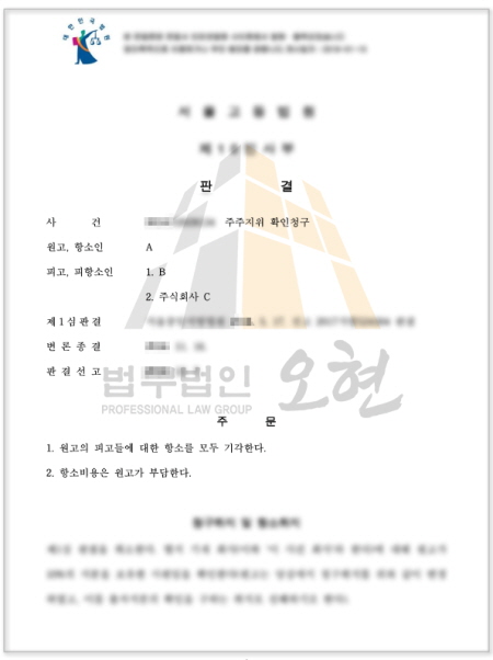법무법인 오현이 철저한 사실관계 분석과 법리 적용을 통해 의뢰인의 지분 전부에 대한 법적 권리를 확정받은 대표적 성공사례입니다.