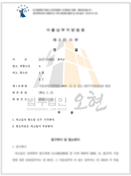 그러나 피고들은 1심 판결에 불복하여 항소하였고, 이에 대해 우리 법무법인 오현은 항소심 단계에서도 강력한 법리적 대응을 통해 기각 판결을 이끌어내는 데 성공하였습니다.